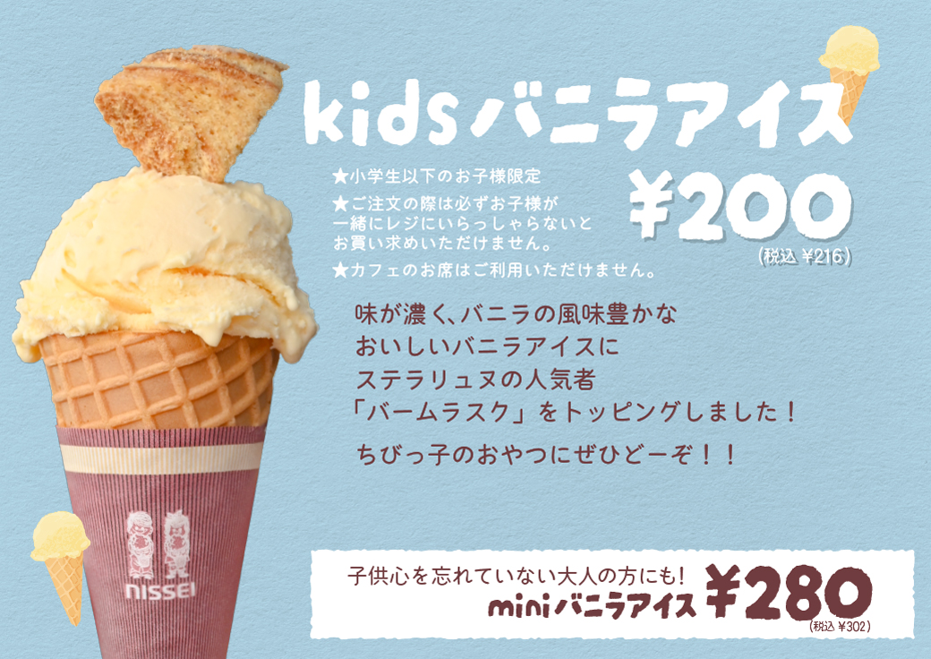 2026.02.02 新商品 kidsバニラアイス登場しました! 味が濃く、バニラの風味豊かな美味しいバニラアイスに ステラリュヌの人気者「バームラスク」をトッピングしました! ちびっ子のおやつにぜひどーぞ☆ ※小学生以下のお子様限定 ※ご注文の際は必ずお子様が一緒に レジにいらっしゃらないとお買い求めいただけません。 ※カフェのお席はご利用いただけません。 ★香芝本店 ★イオンモール大和郡山店 ★トモルテたわらもと店 ★そよら長原駅前店 以上のカフェ併設店舗にて販売中です!